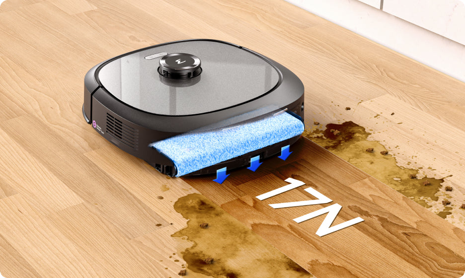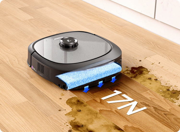 Skruber gulve med robust 17N nedadgående tryk for grundigt at fjerne genstridigt snavs og spild.